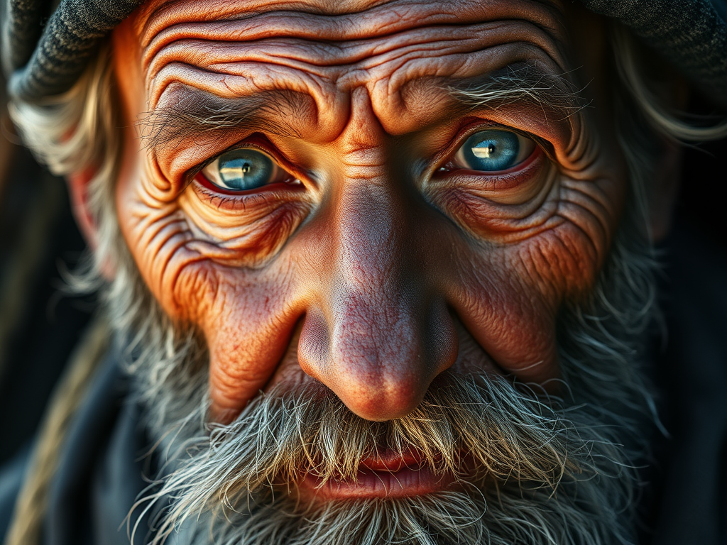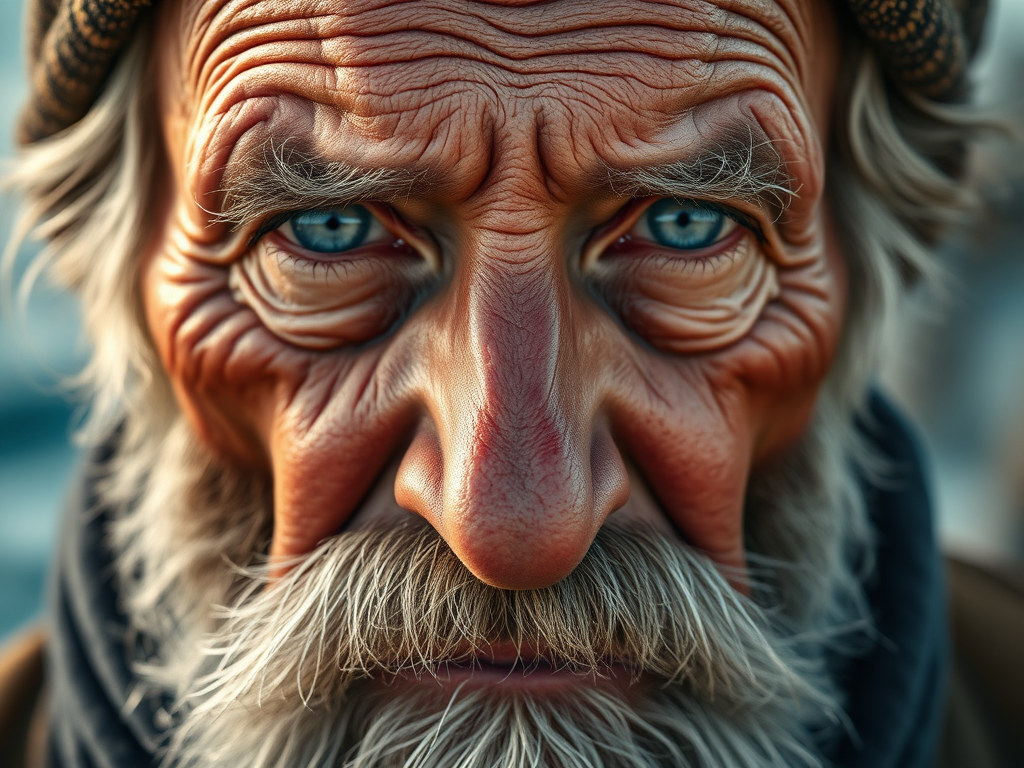 A close-up portrait of an elderly fisherman, sun-weathered skin, deep wrinkles, salt in beard, piercing blue eyes, harsh morning light
