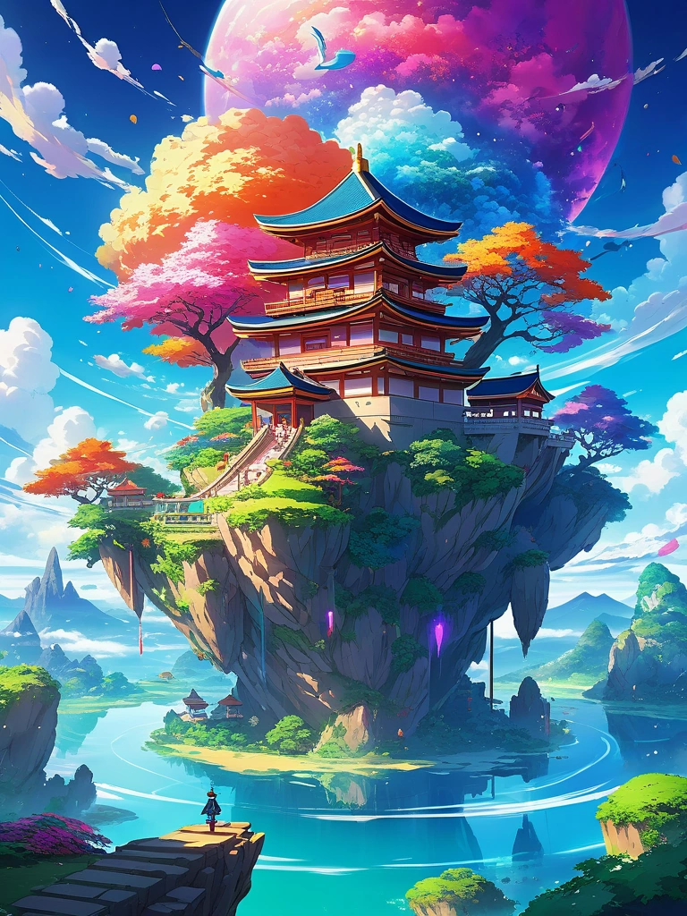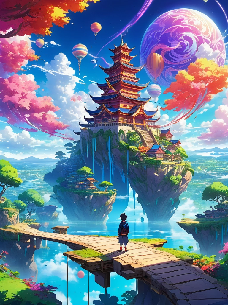 A dreamscape where the sky is a swirling mix of colors and floating islands.