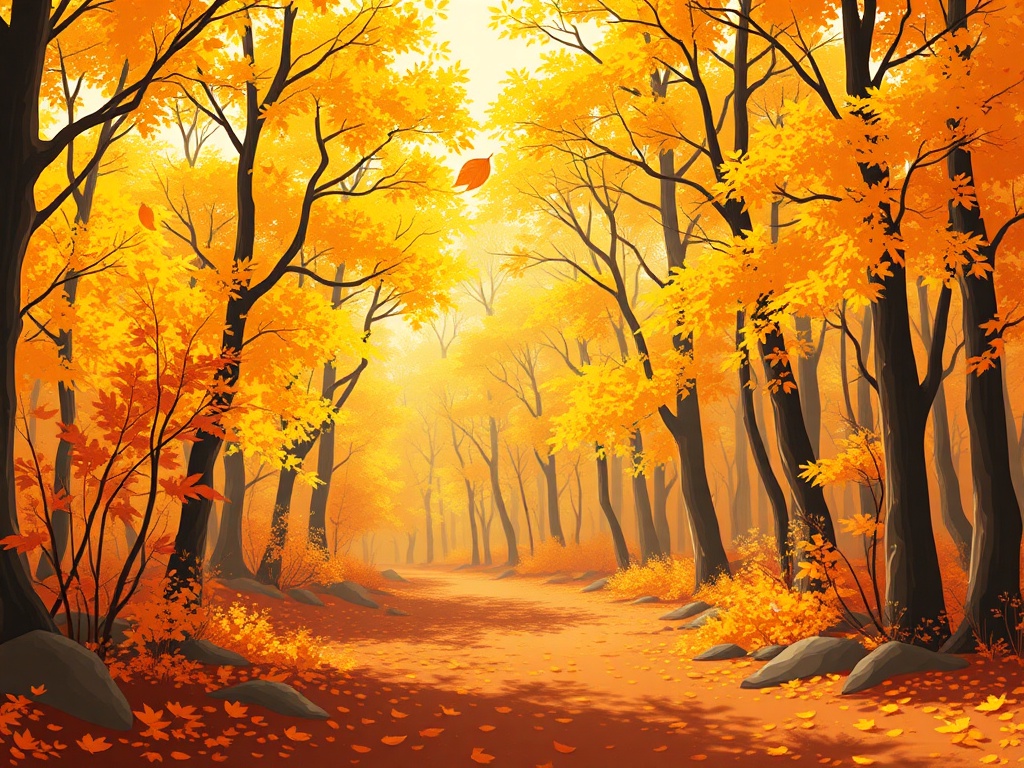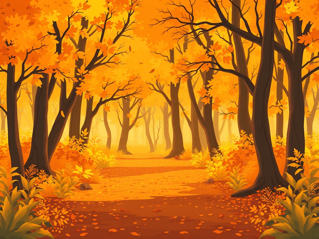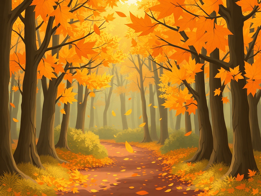 A golden autumn forest with leaves floating down