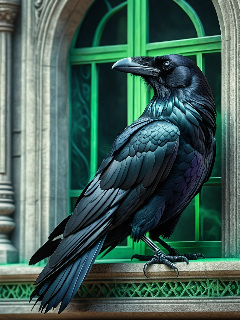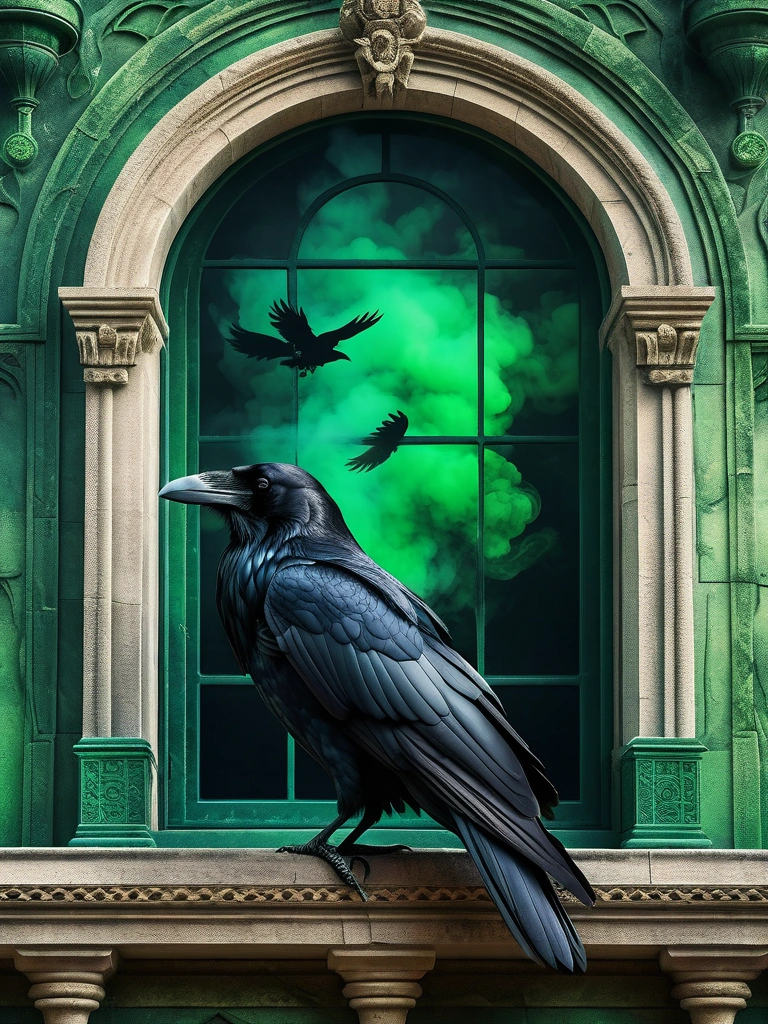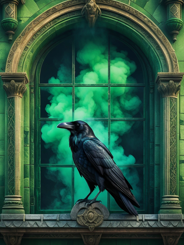 A huge raven sits on the window of a palace that comes from the green smoke