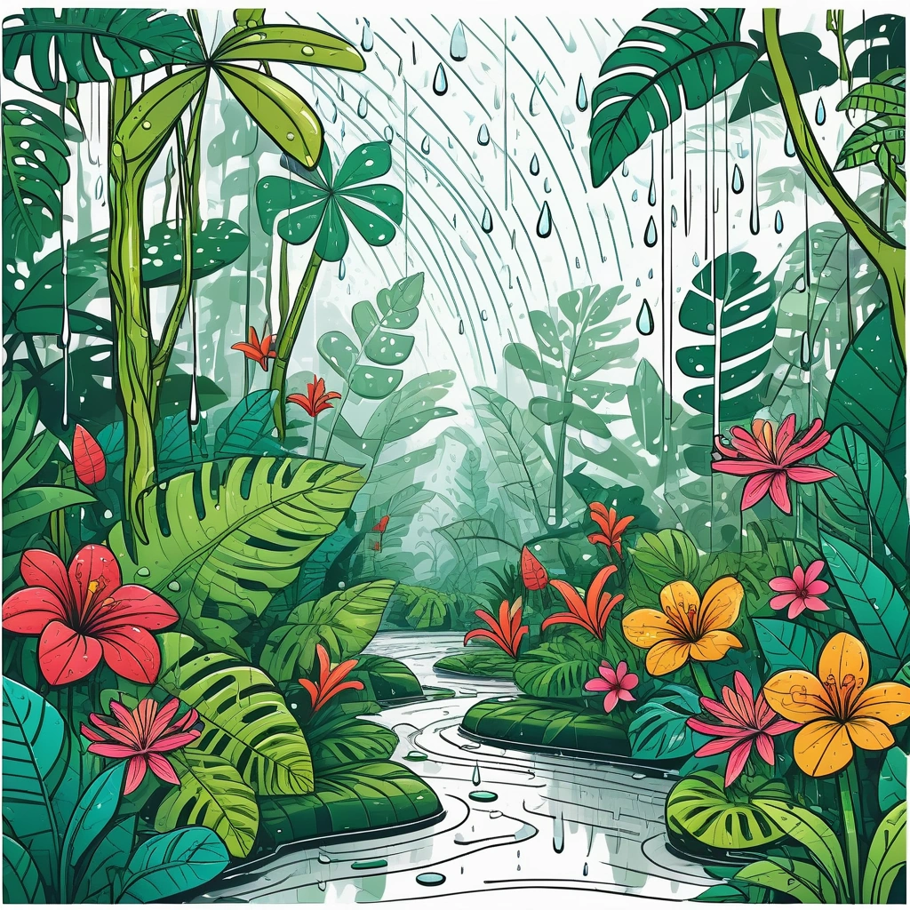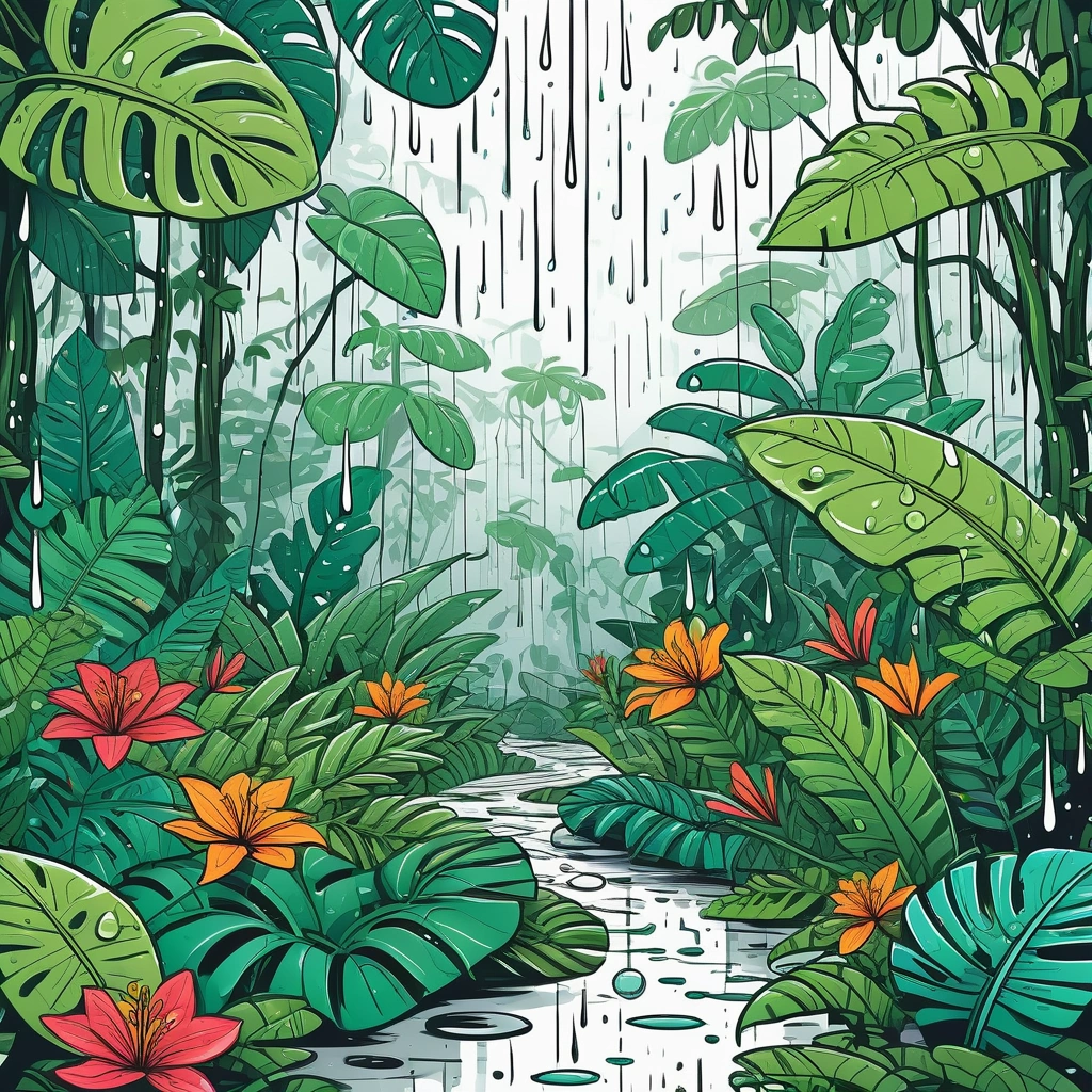 A rain-soaked rainforest with large, lush leaves and vibrant flowers