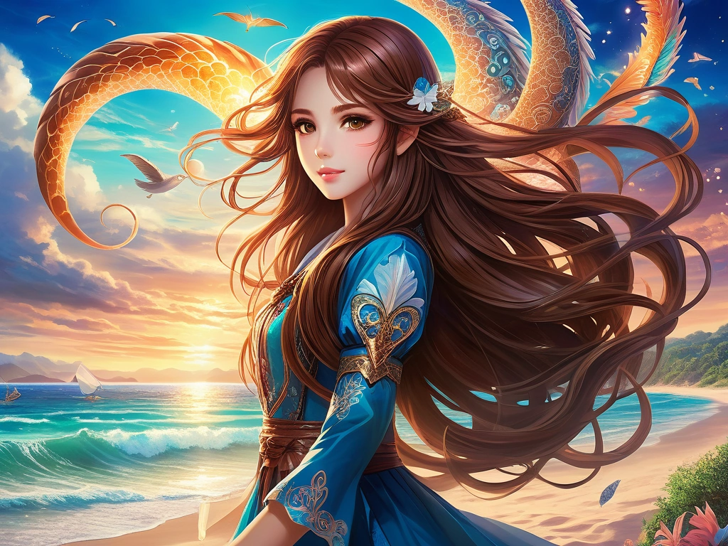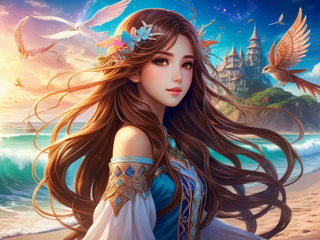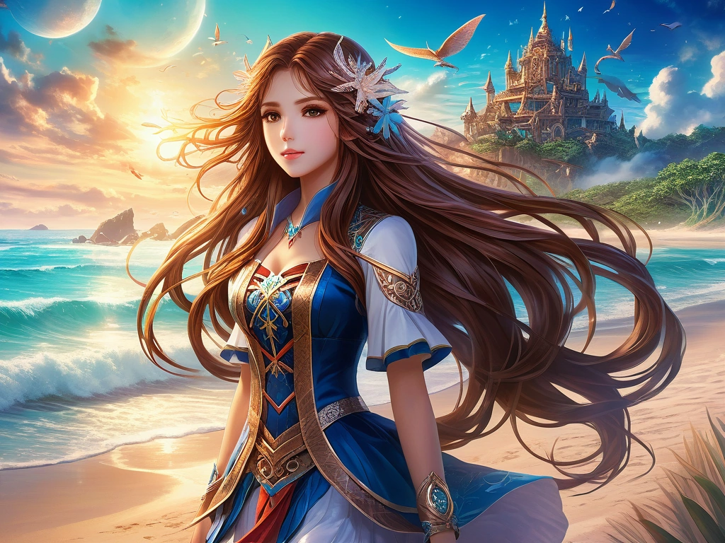 anime girl with long brown hair at beach