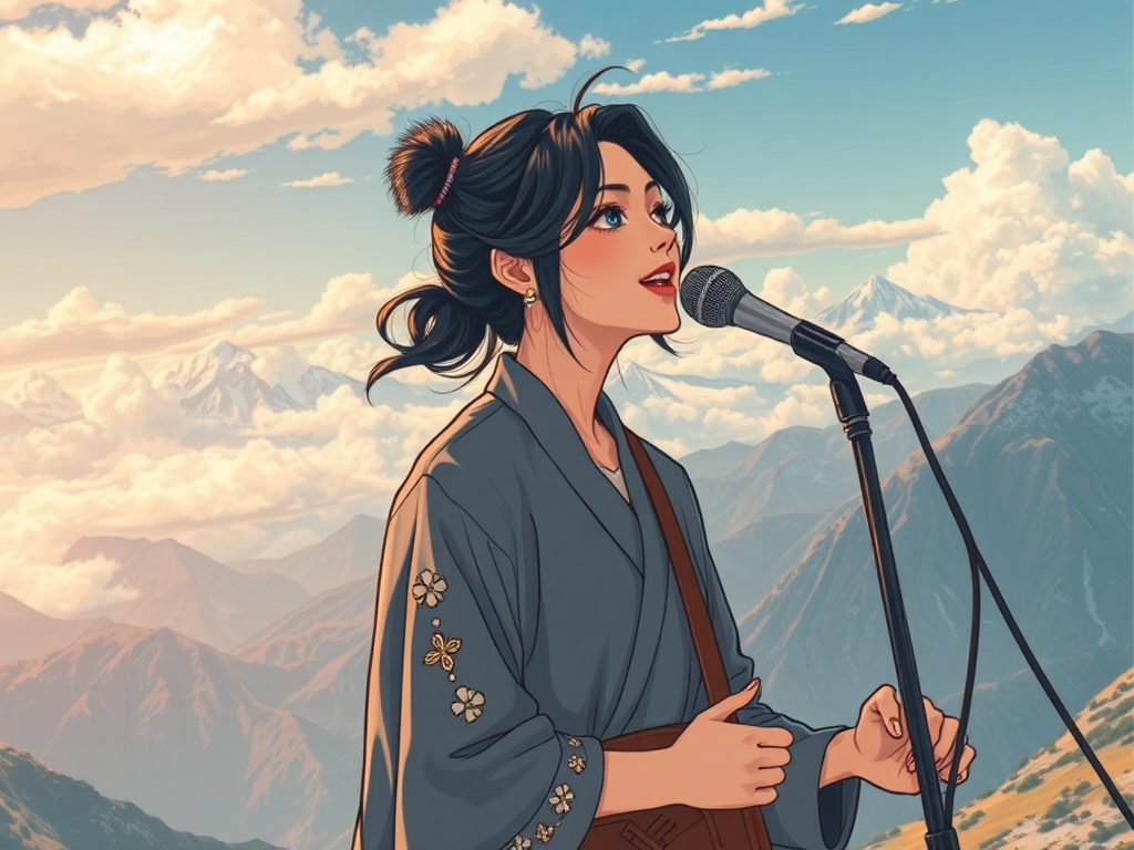 Asian singer on mountains, manga style