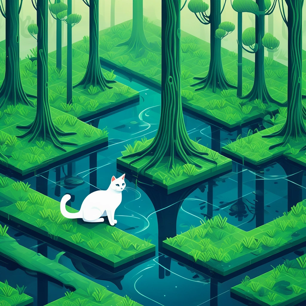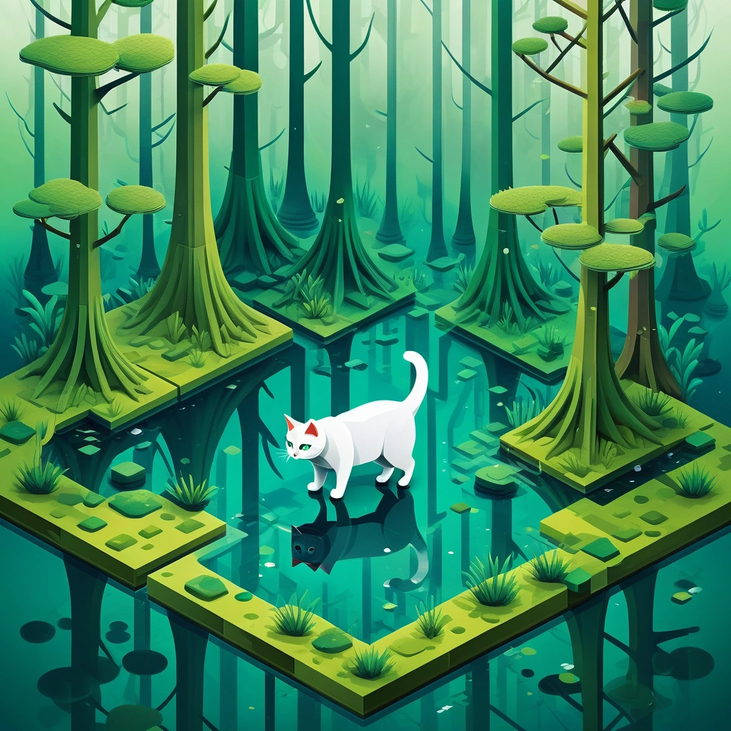 Cat in A mysterious misty swamp with cypress trees and hanging moss