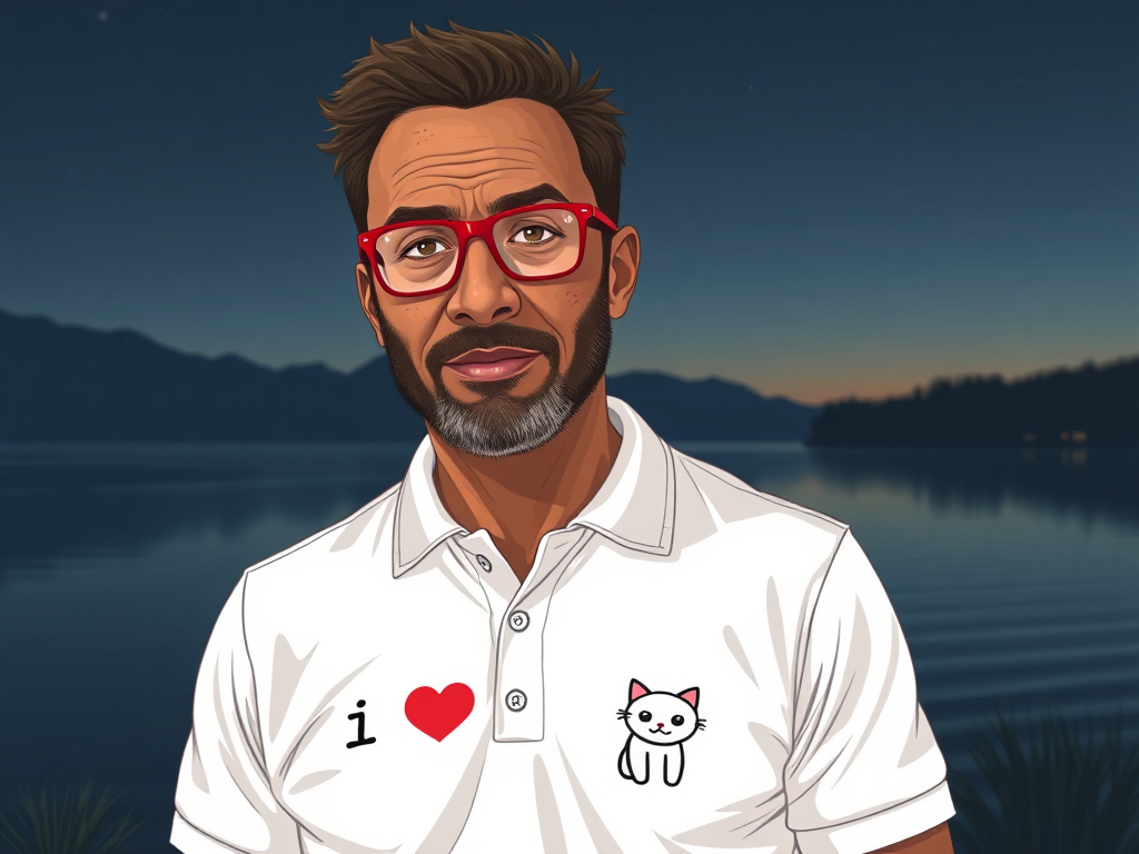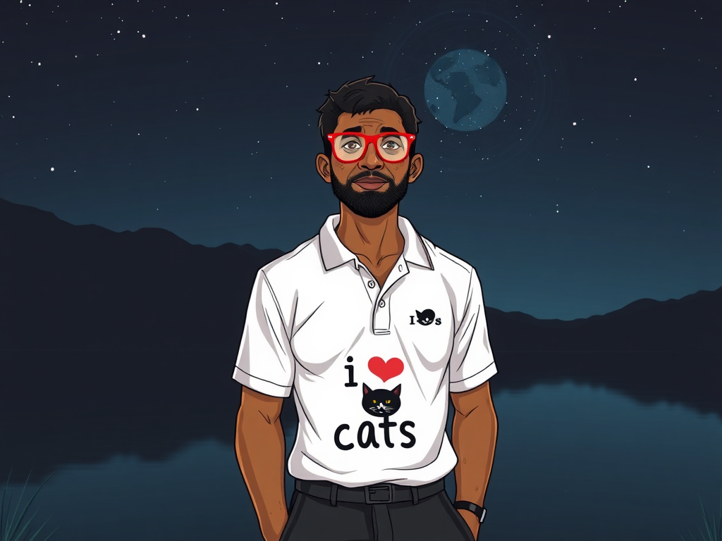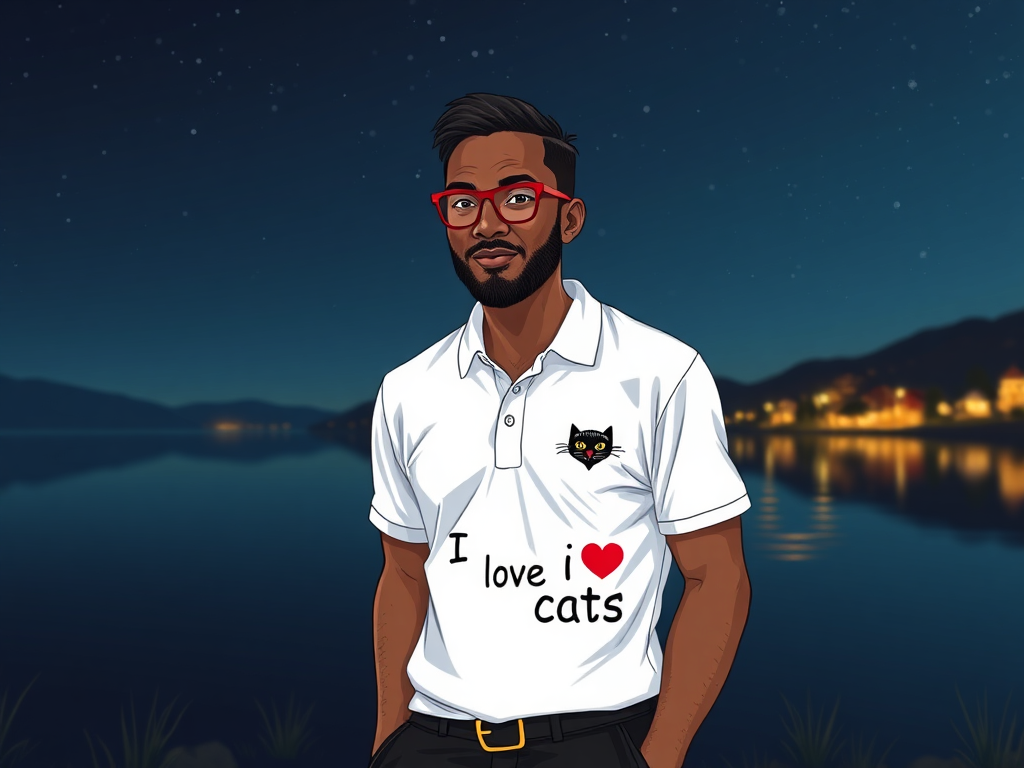 illustration of a 40 years old man african in red glasses with freckles in white polo with text [I LOVE CATS] and cat logo on it and black shortsfull body shot view, he standing near big lake in night