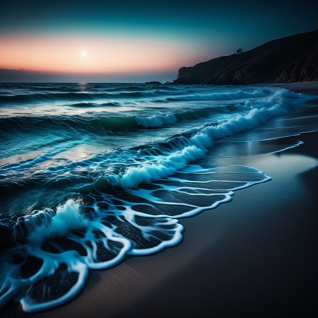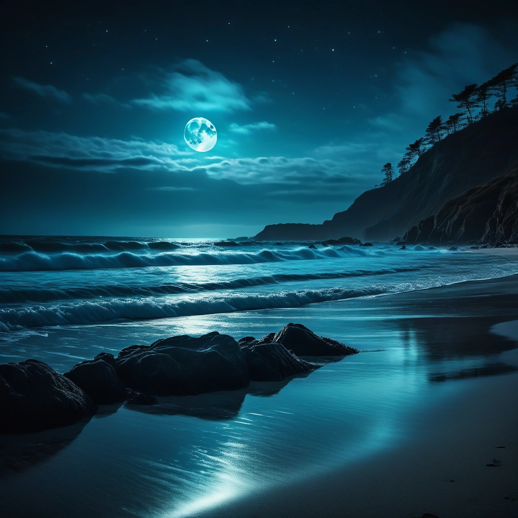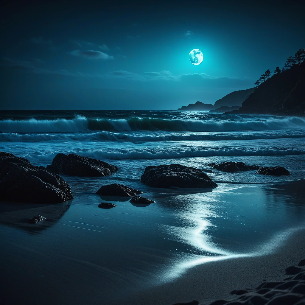 Mystical moonlit beach with glowing bioluminescent waves crashing against the shore