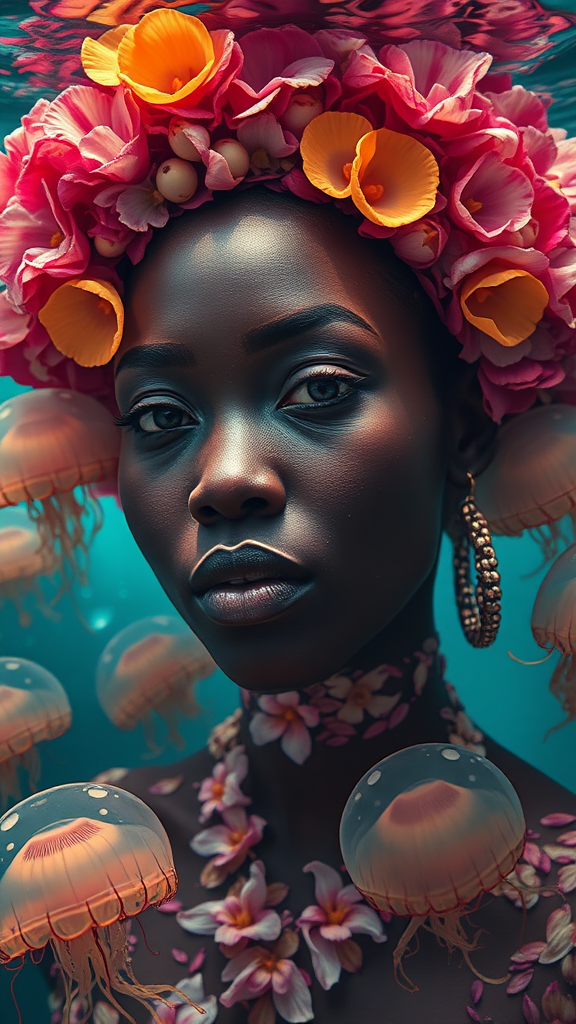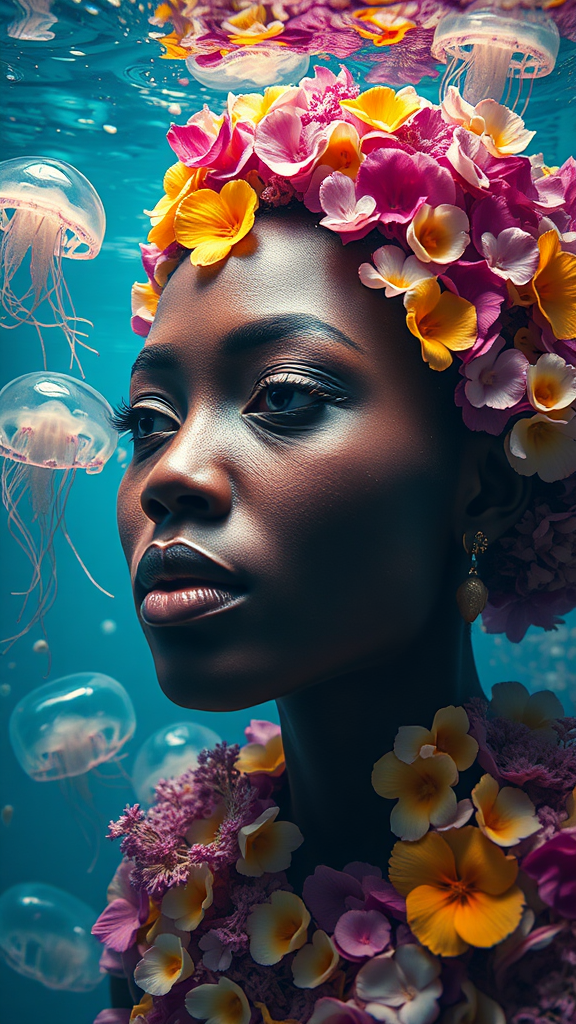 portrait of a african woman made entirely from flower petals, pressed floral art underwater, passengers are transparent jellyfish, 8k, full HD