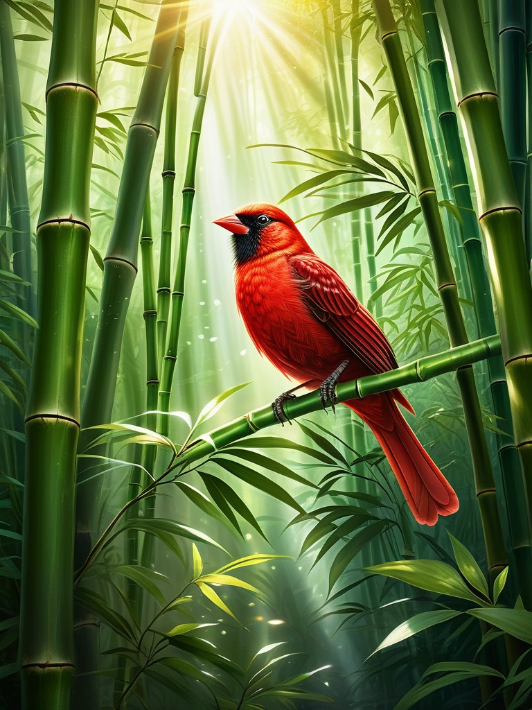 Red Bird in A lush bamboo grove with sunlight streaming through