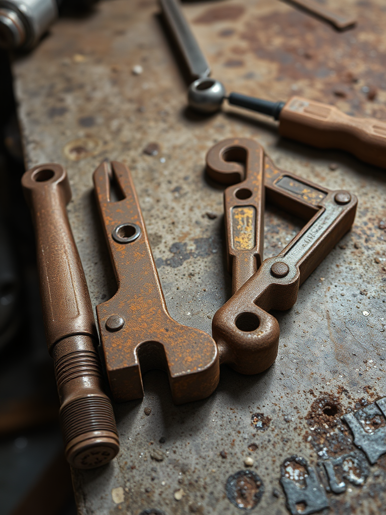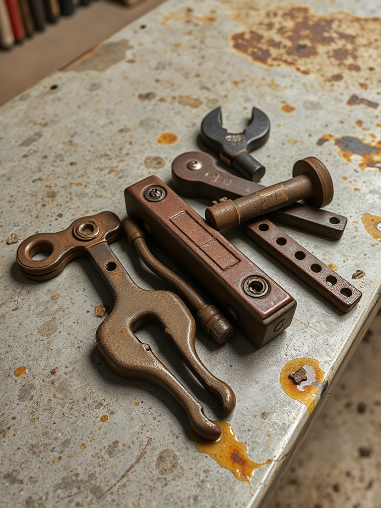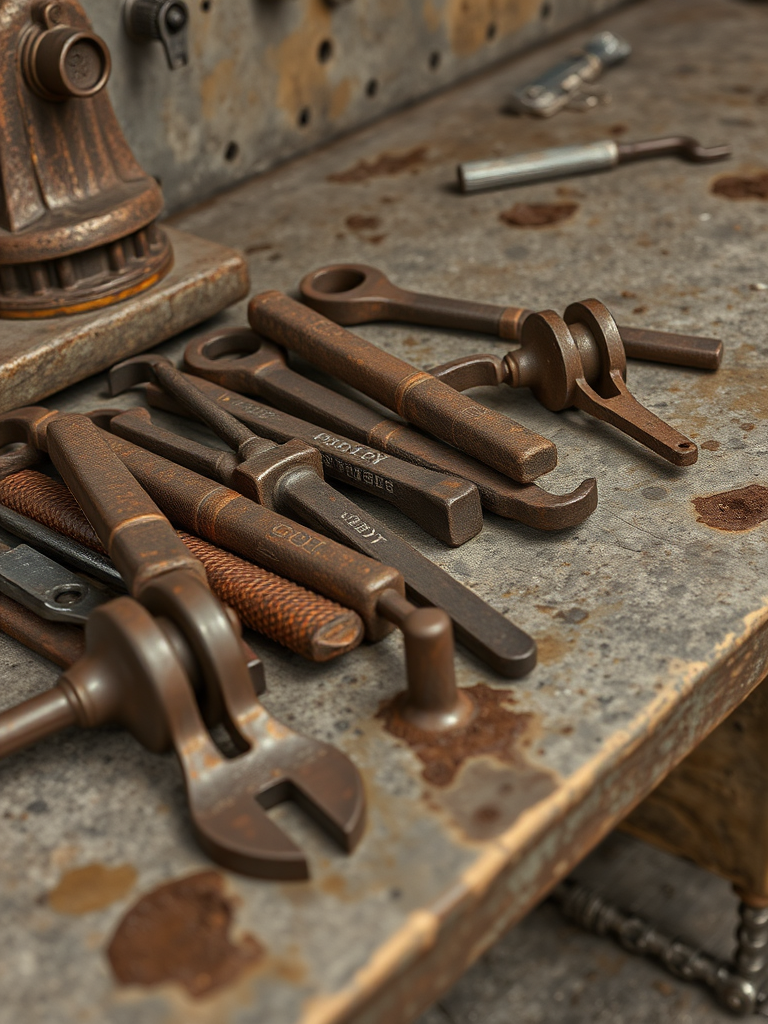 Rusty tools on a concrete workbench, grease stains