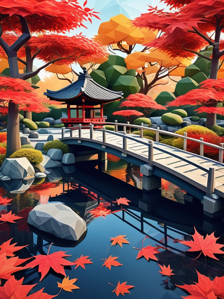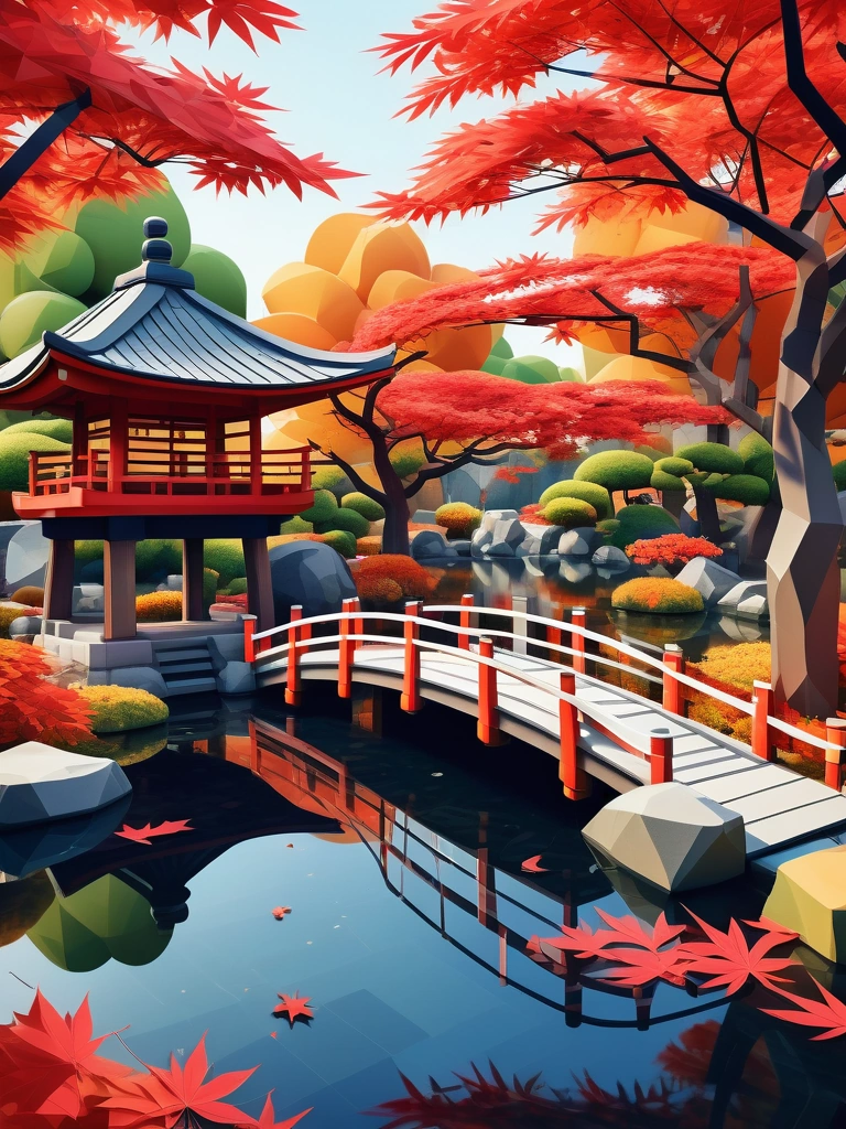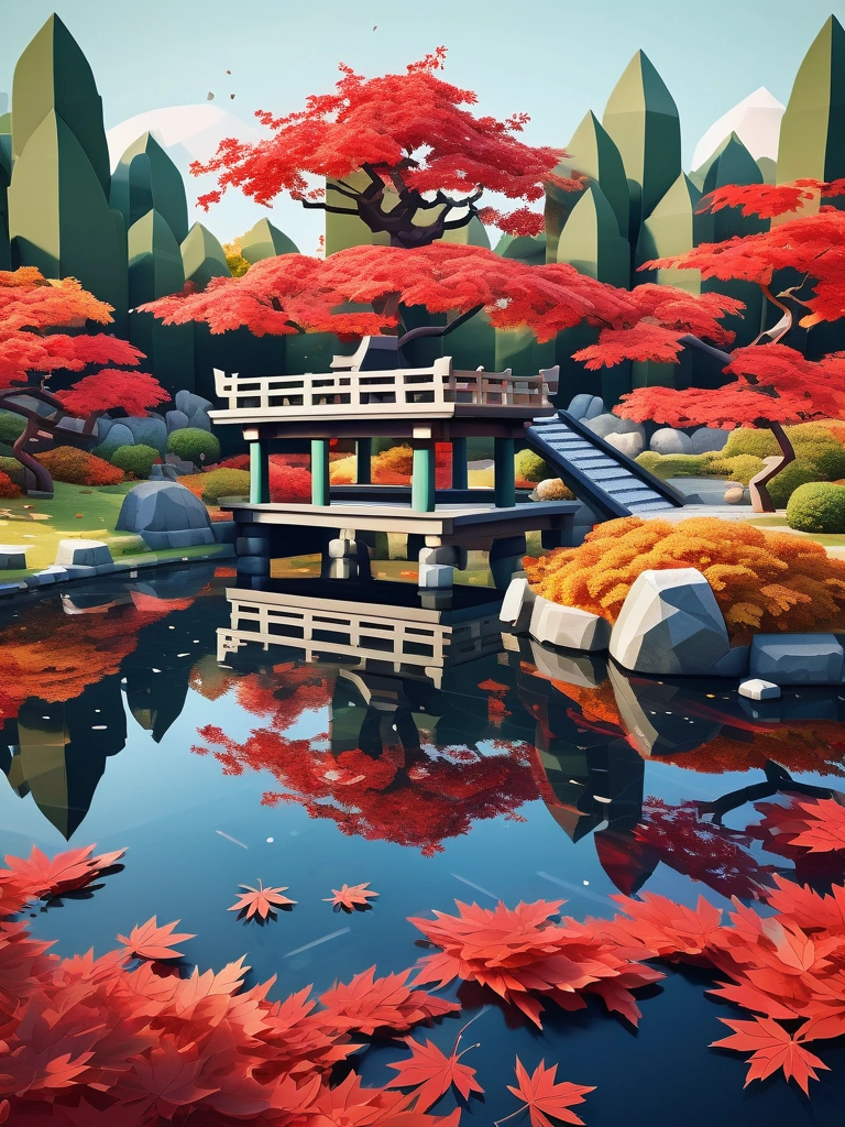 Traditional Japanese garden during autumn, with red maple leaves falling into a serene pond