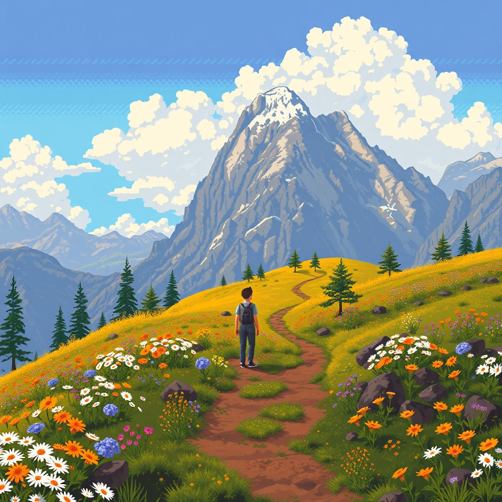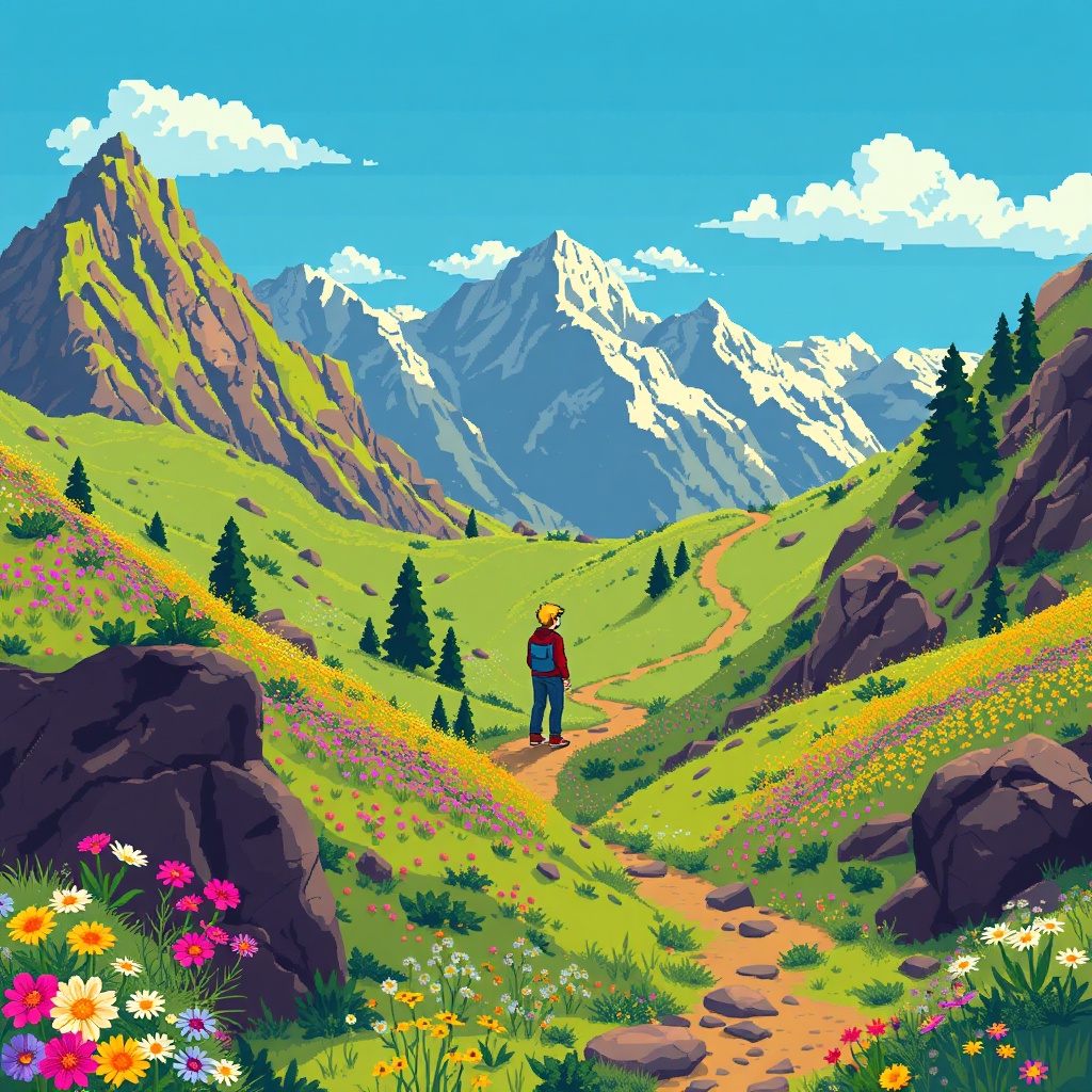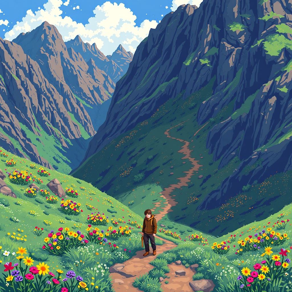Young man in A mountain covered in wildflowers and rugged trails